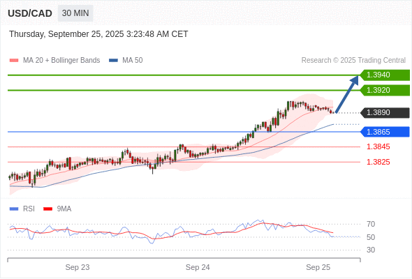 在 1.3865 之上,看涨,目标价位为 1.3920 ,然后为 1.3940 。