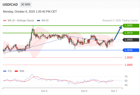 在 1.3935 之上,看涨,目标价位为 1.3970 ,然后为 1.3985 。
