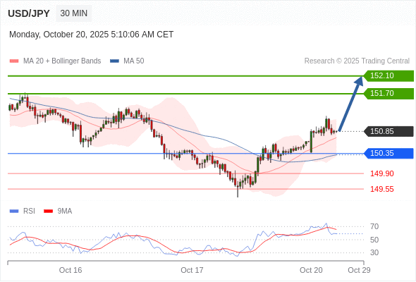在 150.35 之上,看涨,目标价位为 151.70 ,然后为 152.10 。