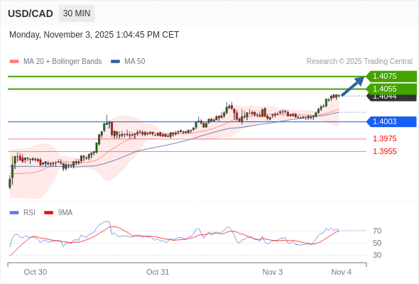 在 1.4000 之上,看涨,目标价位为 1.4055 ,然后为 1.4075 。