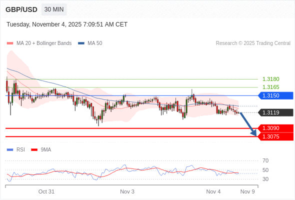 在 1.3150 之下,看跌,目标价位为 1.3090 ,然后为 1.3075 。