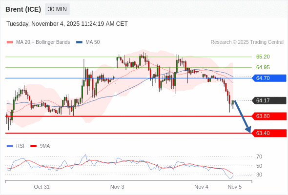 在 64.70 之下,看跌,目标价位为 63.80 ,然后为 63.40 。