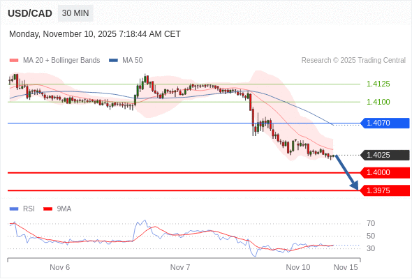 在 1.4070 之下,看跌,目标价位为 1.4000 ,然后为 1.3975 。