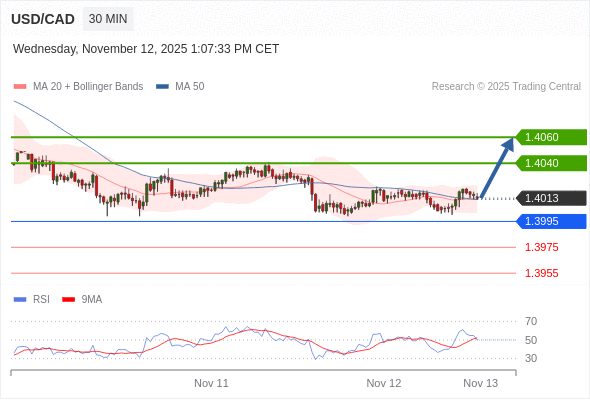在 1.3995 之上,看涨,目标价位为 1.4040 ,然后为 1.4060 。