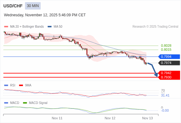 美元/瑞郎 当日内 : 看跌,在 0.7994 之下。