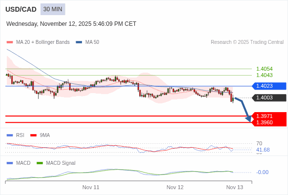 美元/加元 当日内 : 看跌,在 1.4023 之下。