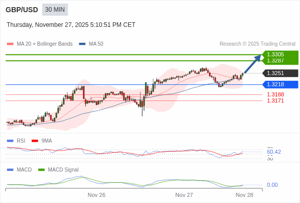 英镑/美元 当日内 : 看涨,当 1.3218 为支撑位。