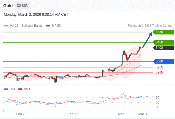 交易策略: 在 5300 之上,看涨,目标价位为 5450 ,然后为 5530 。
