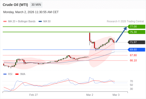 在 69.60 之上,看涨,目标价位为 75.30 ,然后为 77.00 。