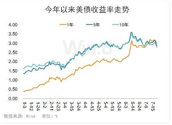 具体走势上,首先从美债来看,Wind数据显示,今年以来美债各期收益率均出现大幅上升。1年期从年初的0.4%已上升至目前3.01%;5年期则从年初1.37%到6月中旬最高3.61%,最近回落至2.87%;10年从1.63%也大幅上升至最新的2.77%。