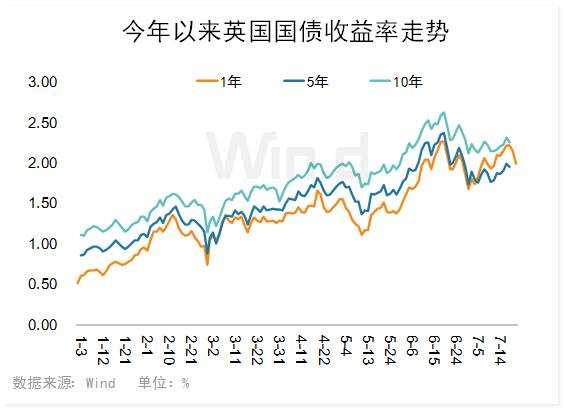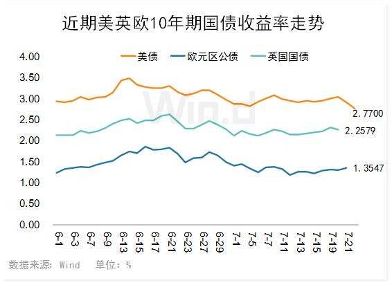 随着发达经济体加息开启,其国债收益率并没有持续上涨。Wind数据显示,以10年期国债收益率来看,目前最高为美国,紧随其后则是英国,欧元(1.0247, 0.0027, 0.26%)区较低。其中美债收益率7月份最高一度突破3%,随后持续回落;英国10年期国债收益率较平稳,7月份均在2.1%~2.3%之间运行;而欧元区公债收益率则保持1.5%以下,近日欧央行加息对其影响不大。