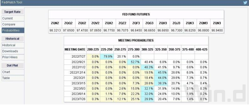 美联储计划将于北京时间7月28日凌晨公布7月份利率决议结果。据CME‘美联储观察’,美联储到7月份加息75个基点的概率为79.9%,加息100个基点的概率为20.1%。